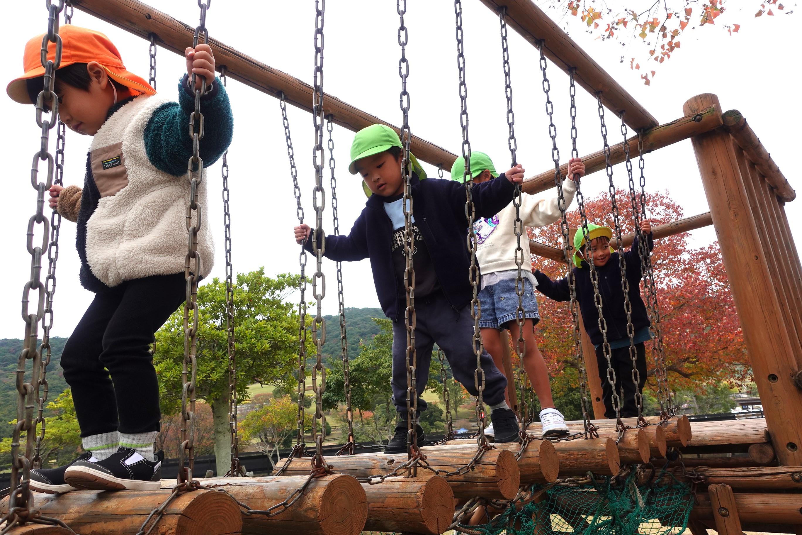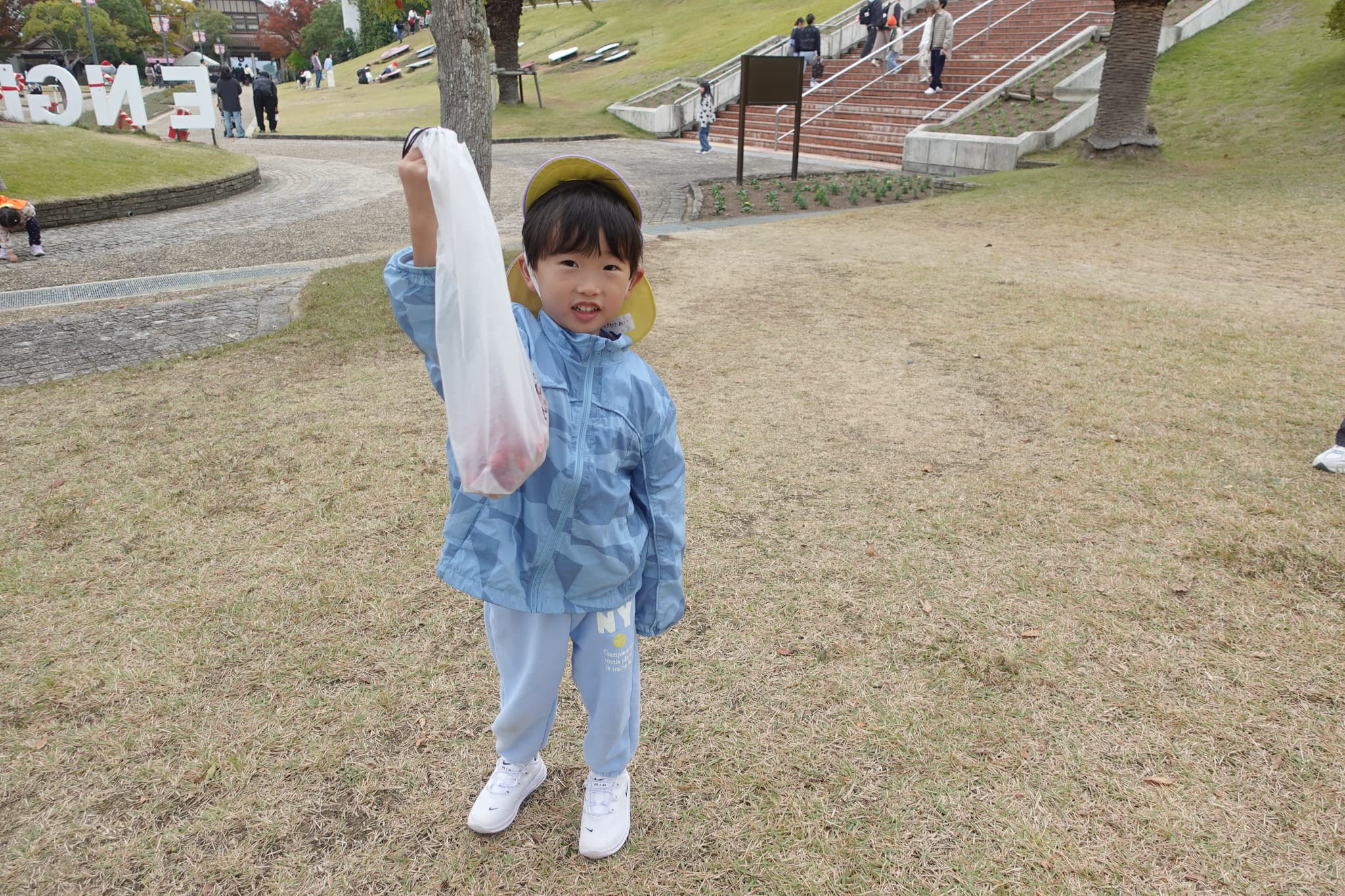 午後も笑顔あふれる子どもたち。ヒメリンゴがたくさん落ちていて、お友達と拾い集めていました。